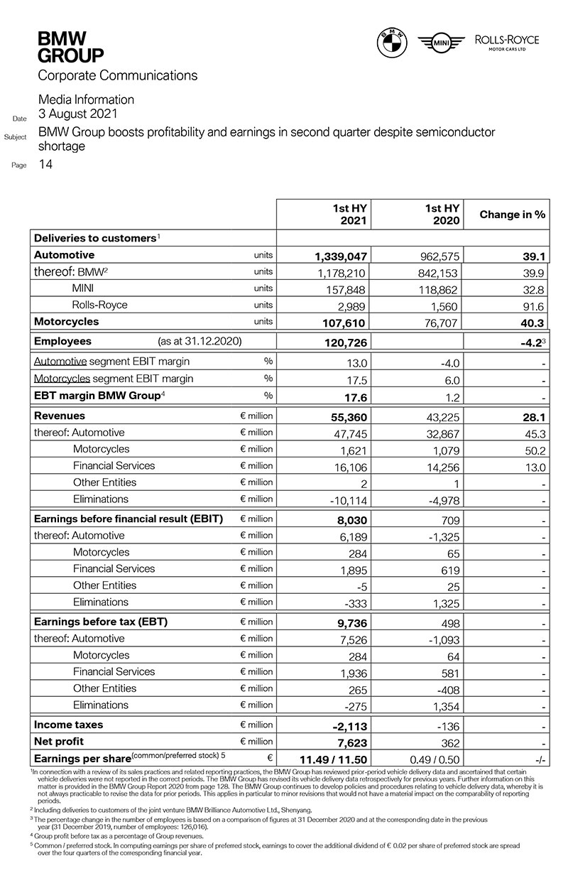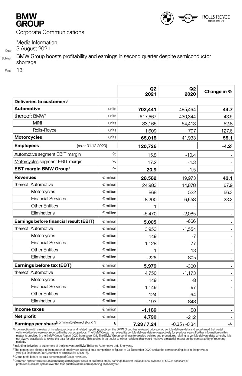 Marja xəbər verir ki, hər iki iri istehsalçı ötən ilə nisbətən kifayət qədər böyük həcmli mənfəət əldə edib. BMW-nin 2021-ci ilin 2-ci rübündəki gəlirləri 43% artaraq 28,58 milyard avro (33,96 milyard dollar), xalis mənfəəti 4,79 milyard avro (5,69 milyard dollar) təşkil edib. Ötən ilin 2-ci rübündə gəlirlər 19,97 milyard avro olmuş, BMW rübü 212 milyon avro zərərlə başa vurmuşdu. Bütövlükdə bu ilin birinci yarısında mənfəət 7,62 milyard avro (9,05 milyard dollar) təşkil edib.