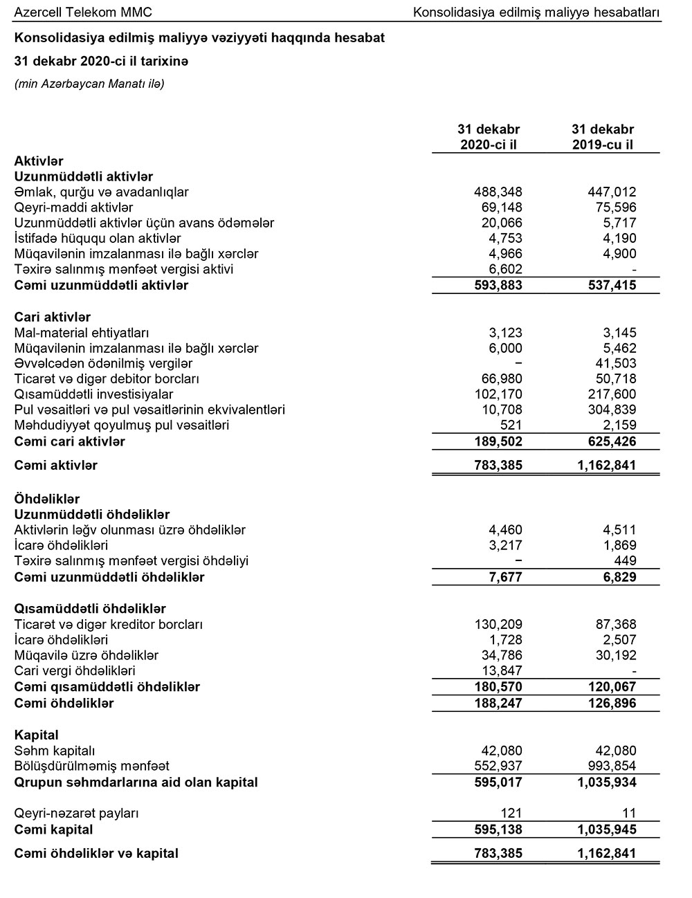 Ötən il Azercellin cəmi aktivləri 379 milyon 456 min manat və ya 32,6% azalaraq 783 milyon 385 min manata düşüb. Şirkət 2019-cu ilin sonunda 1 milyard 162 milyon 841 min manat cəmi aktivlərə malik idi. Aktivlərin kəskin azalmasının əsas səbəbi pul vəsaitləri və pul vəsaitlərinin ekvivalentlərinin 2019-cu ilin sonundakı 304 milyon 839 min manatdan 10 milyon 708 min manata geriləməsidir. Şirkətin qısamüddətli investisiyaları da 217 milyon 600 min manatdan 102 milyon 170 min manata düşüb.