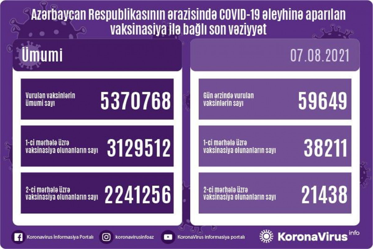 Azərbaycanda son sutkada koronavirus (COVID-19) əleyhinə 59649 vaksin vurulub.