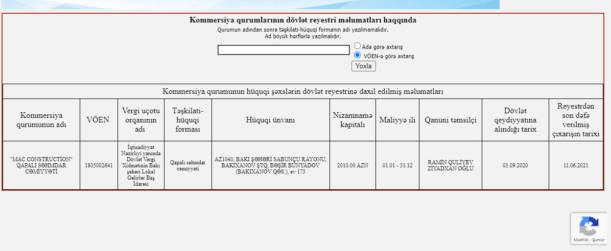 Qeyd edək ki, 2020-ci ilin Sentyabr ayında yaradılmış “MAC Construction” QSC 2010 manat nizamnamə kapitalına malikdir. Şirkətin qanuni təmsilçisi Quliyev Ramin Ziyadxan oğludur. Şirkətin hüquqi ünvanı Bakı şəhəri, Sabunçu rayonu, Bakıxanov qəsəbəsindədir.