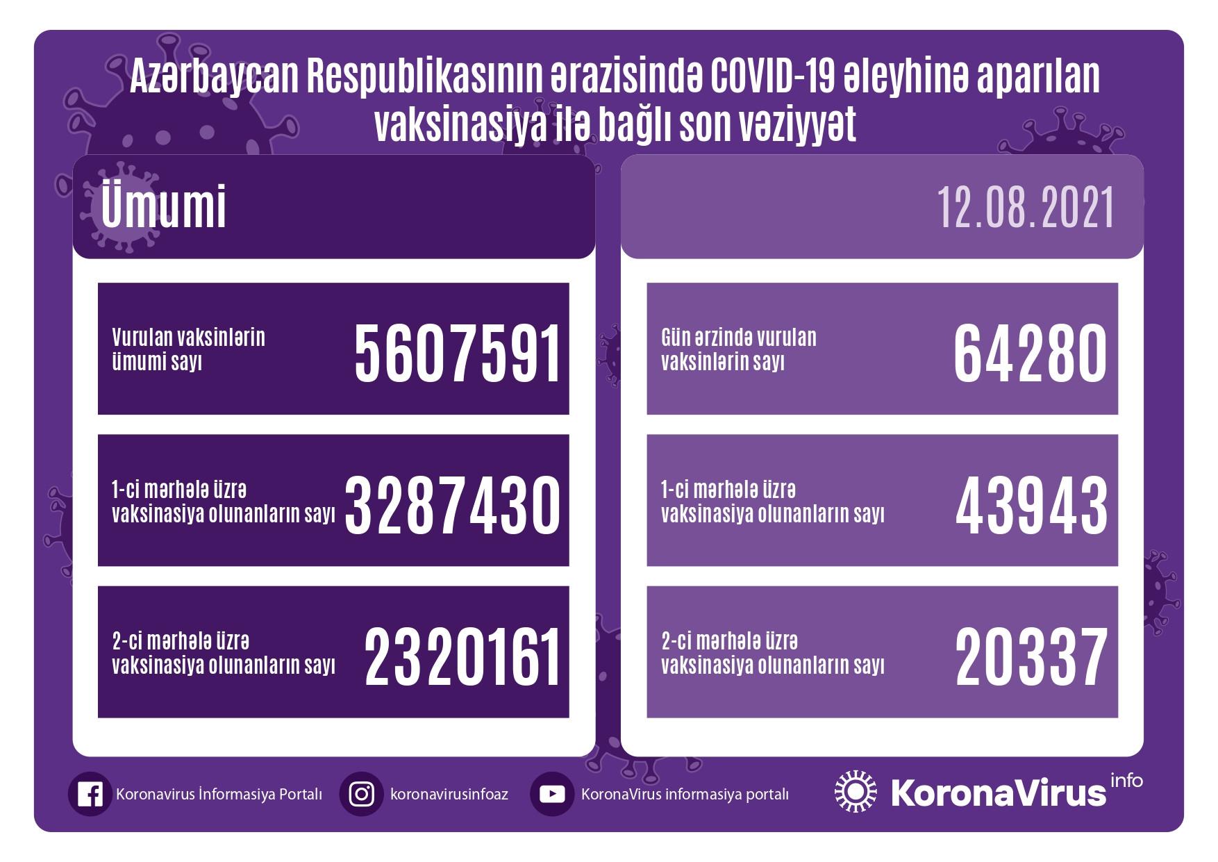 Hazırkı dövrədək ölkəmizdə vurulan vaksin dozalarının ümumi sayı 5 607 591, birinci mərhələ üzrə vaksinasiya olunanların ümumi sayı 3 287 430, ikinci mərhələ üzrə vaksinasiya olunanların sayı isə 2 320 161 təşkil edir.