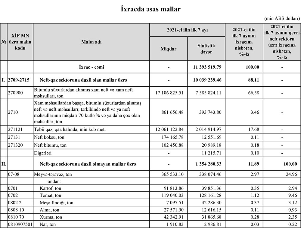 Qeyd edək ki, 2020-ci ilin 7 ayı ərzində Azərbaycanın xarici ticarət əməliyyatlarının həcmi 15 milyard 31 milyon 904 min ABŞ dolları, o cümlədən idxal 5 milyard 900 milyon 766 ABŞ dolları, ixrac 9 milyard 131 milyon 138 min ABŞ dolları, saldo 3 milyard 230 milyon 371 min ABŞ dolları təşkil etmişdi.