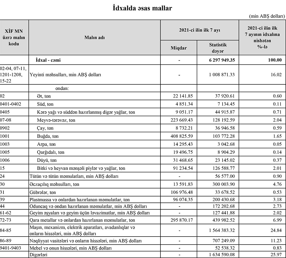 Neft-qaz sektoruna daxil olan malların ixrac 2021-ci ilin ilk 7 ayında Azərbaycanın cəmi 11 milyard 393 milyon 519 min dollarlıq icracının 88,1%-nə bərabər olub. Qeyri-neft qaz məhsullarının ixracının həcmi 1 milyard 354 milyon 280 min dollar təşkil edib.
