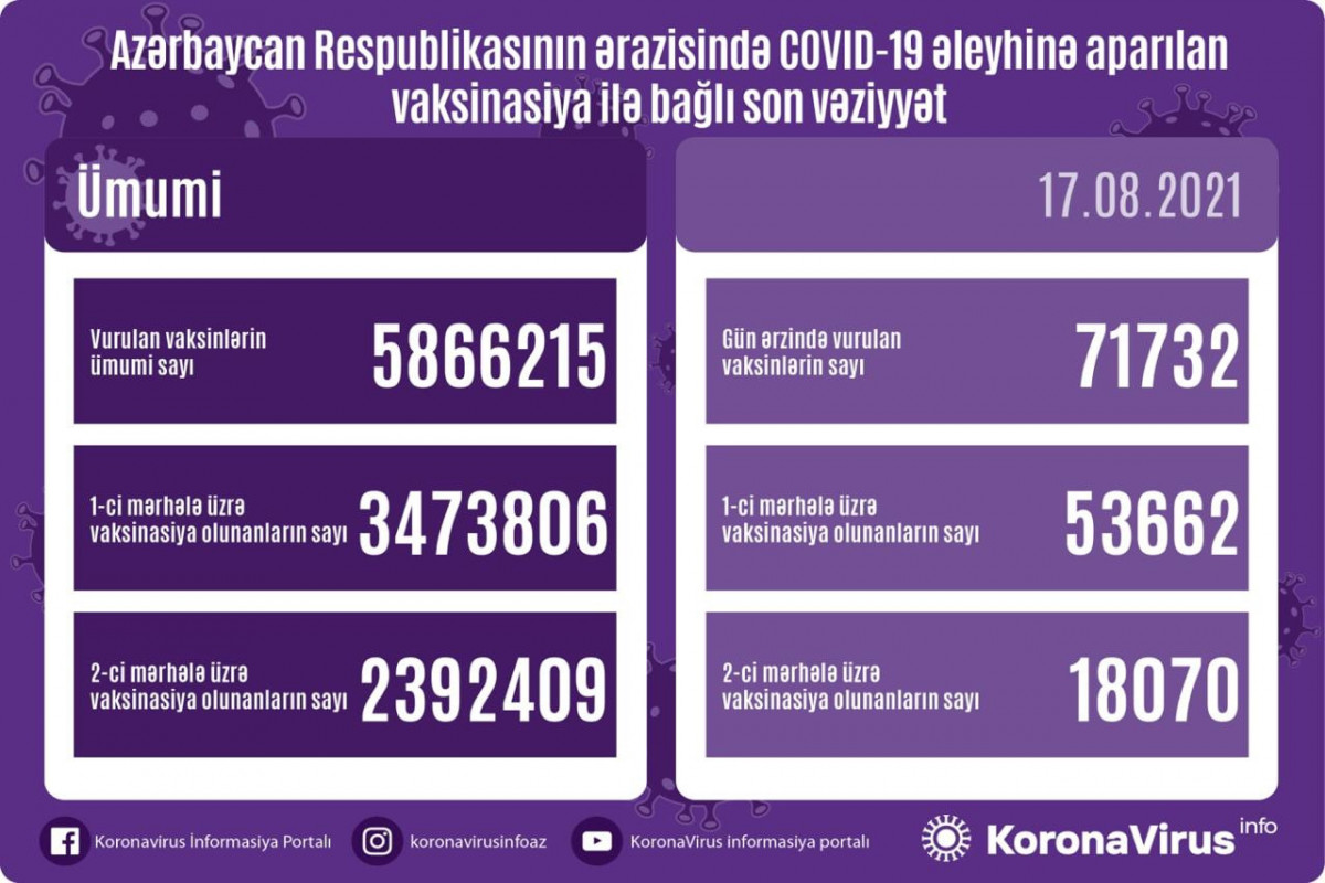 Nazirlər Kabineti yanında Operativ Qərargahdan verilən məlumata görə, bir gündə birinci mərhələ üzrə vaksinasiya olunanların sayı 53 662, ikinci mərhələ üzrə vaksinasiya olunanların sayı 18 070 nəfərdir.