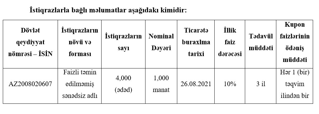Marja xəbər verir ki, QSC hər birinin nominal dəyəri 1 min manat olan 4 min ədəd faizli təmin edilməmiş sənədsiz adlı istiqraz buraxıb. İstiqrazlar üzrə illik faiz dərəcəsi 10% müəyyən edilib. Kupon faizləri ildə bir dəfə ödəniləcəkdir.
