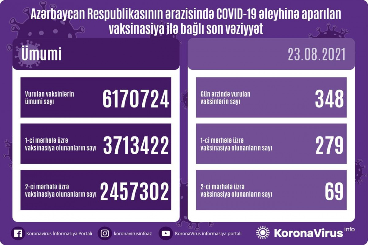 Ölkədə vurulan vaksinlərin ümumi sayı 6170724, birinci mərhələ üzrə vaksinasiya olunanların ümumi sayı 3713422, ikinci mərhələ üzrə vaksinasiya olunanların sayı isə 2457302 təşkil edir.