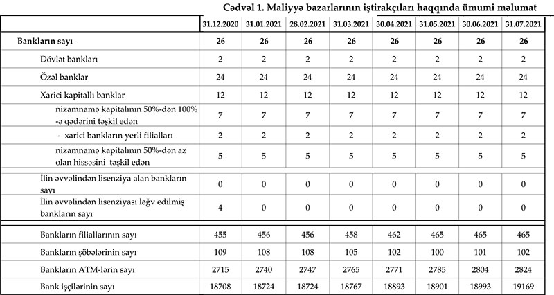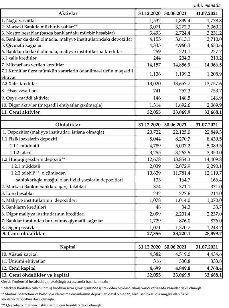31 İyul 2021-ci il tarixinə olan bank sektorunun əsas göstəriciləri açıqlanıb.