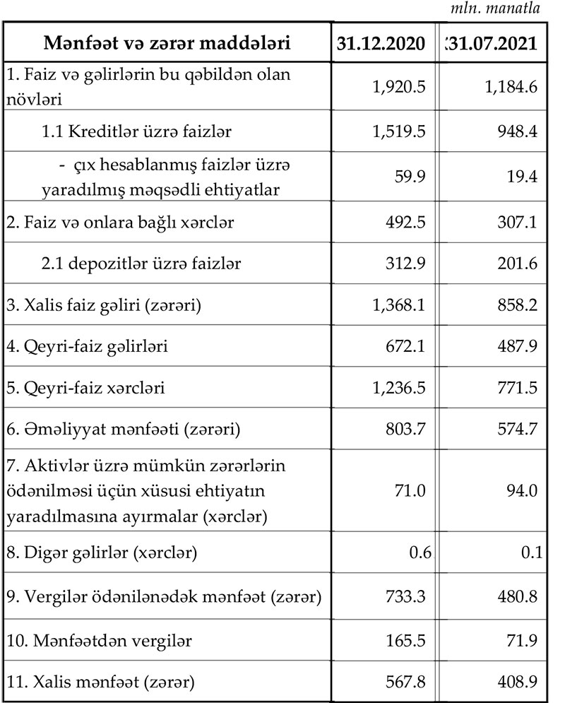 Azərbaycanın bank sektoru 2021-ci ilin 7 ayını 408,9 milyon manat xalis mənfəət ilə başa vurub. Bu ötən ilin eyni dövrü ilə müqayisədə 4,5% azdır. Ötən ilin eyni dövründə sektorun xalis mənfəəti 428,1 milyon manat təşkil etmişdi.