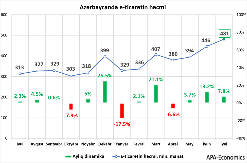 2021-ci ilin iyul ayında Azərbaycan əhalisi tərəfindən bank kartları ilə elektron ticarət (e-ticarət) şəbəkəsində 481 milyon manat həcmində ödəniş həyata keçirilib. Bu, indiyədək qeydə alınan ən yüksək aylıq göstəricidir. Bundan əvvəlki rekord iyun ayında qeydə alınmışdı - 446 milyon manat.