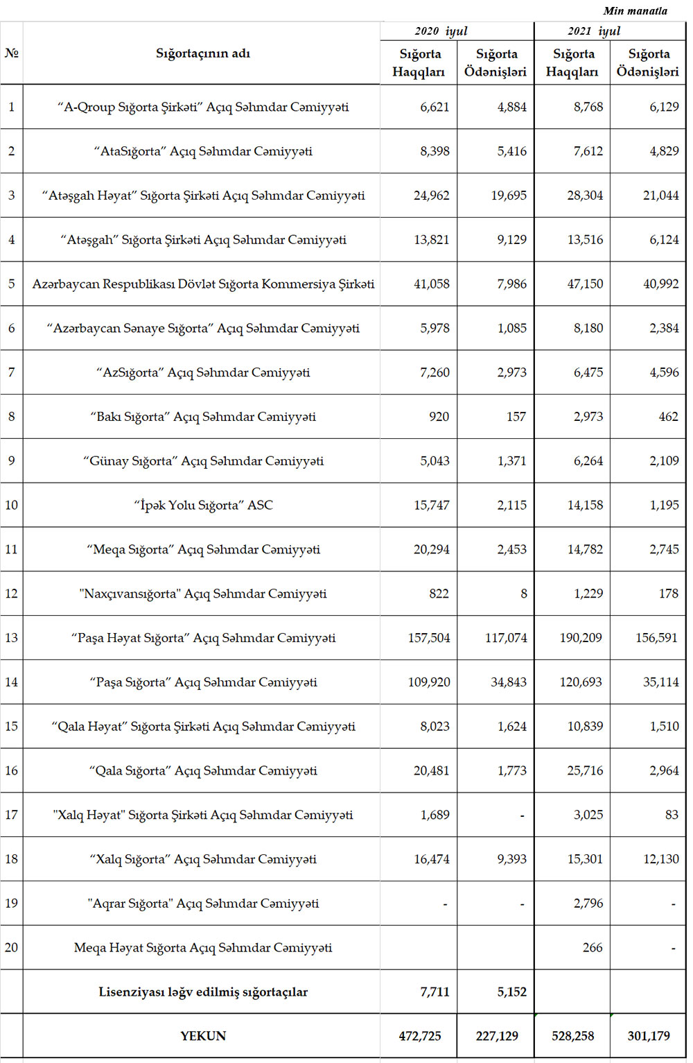 Sığortaçılar üzrə, 2021-ci ilin yanvar-iyul ayları üzrə hesablanmış sığorta haqları və sığorta ödənişləri
