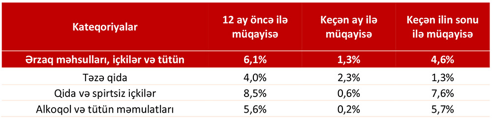 “Veysəloğlu Pərakəndə İndeksi”-nə daxil edilən məhsulların qiymətində 2021-ci ilin avqust ayında 2020-ci ilin avqust ayı ilə müqayisədə 6,1% artım müşahidə edilir. Belə ki, cari ilin avqust ayında ötən ilin avqust ayı ilə müqayisədə təzə qida məhsullarında (qısa müddətli istifadəyə yararlı istehlak məhsulları) 4,0%, qida və spirtsiz içkilərdə 8,5%, alkoqol və tütün məmulatlarında isə 5,6% artım olub.