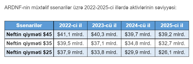 Məlumata görə, daha bədbin ssenarilərdə Neft Fondunun aktivləri gələn il 38 milyard dollara qədər enə bilər. Belə ki, neftin qiymətinin 35 dollar olacağı halda Fondun aktivlərinin həcmi gələn il 39,5 milyard dollara, 25 dollara enəcəyi halda isə 37,9 milyard dollara qədər enəcəyi ehtimal olunur.