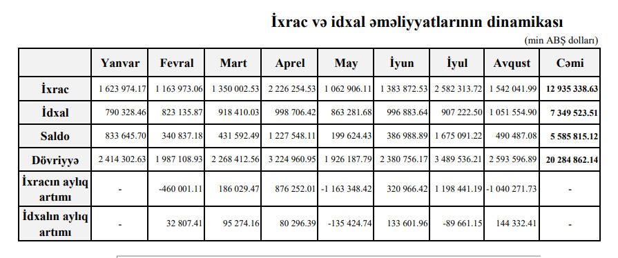 202-ci ilin 8 ayı ərzində (yanvar-avqust) Azərbaycanın xarici ticarət əməliyyatlarının həcmi 20 milyard 284 milyon 862 min ABŞ dolları, o cümlədən ixrac 12 milyard 935 milyon 338 min ABŞ dolları, idxal 7 milyard 349 milyon 523 min ABŞ dolları, saldo 5 milyard 585 milyon ABŞ dolları təşkil edib.