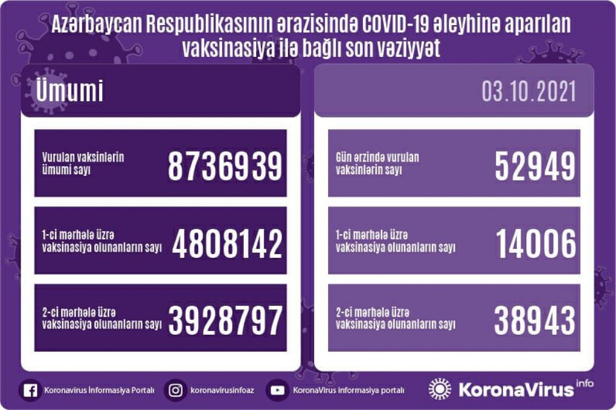 Ölkədə vurulan vaksinlərin ümumi sayı 8 736 939, birinci mərhələ üzrə vaksinasiya olunanların ümumi sayı 4 808 142, ikinci mərhələ üzrə vaksinasiya olunanların sayı isə 3 928 797 təşkil edir.
