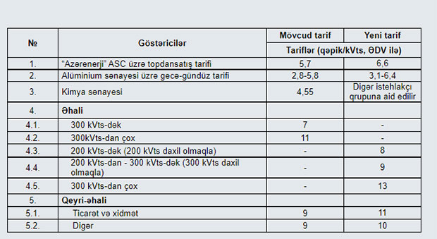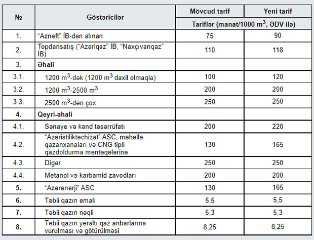 Əhali üçün təbii qazın qiyməti istehlak 1200 m3-dək (1200 m3 daxil olmaqla) olduqda 1000 m3 üçün 100 manatdan 120 manata qaldırılıb. İstehlak 1200 m3-2500 m3-dək olduqda 1000 m3 üçün 250 manatda, 2500 m3-dən yüsək olduqda da 1000 m3 üçün qiymət 250 manatda saxlanılıb. Əhali üçün elektrik enerjisinin tarifi 200 kVts-dək (200 kVts daxil olmaqla) hər kVts üçün 8 qəpik, 200 kVts-dan - 300 kVts-dək (300 kVts daxil olmaqla) olduqda hər kVts üçün 9 qəpik müəyyən edilib.Bu gün Tarif (qiymət) Şurasının növbəti iclasında təbii qazın və elektrik enerjisi tariflərinə baxılıb, müvafiq qərarlar qəbul edilib.