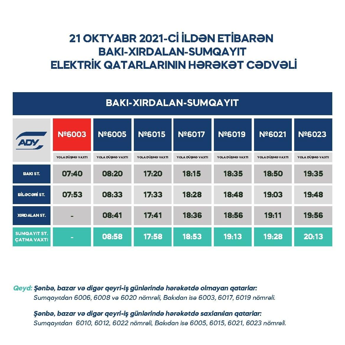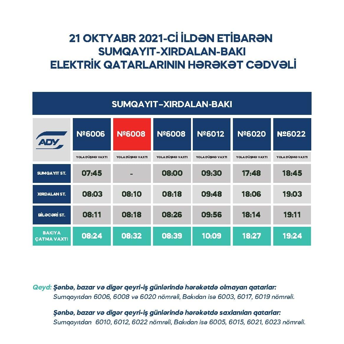 O cümlədən, Xırdalanla Bakı arasında sərnişin axınının güclənməsi müşahidə olunduğundan Bakı-Xırdalan istiqamətində 6003, Xırdalan-Bakı istiqamətində isə 6008 nömrəli qatarlar əlavə olunub.