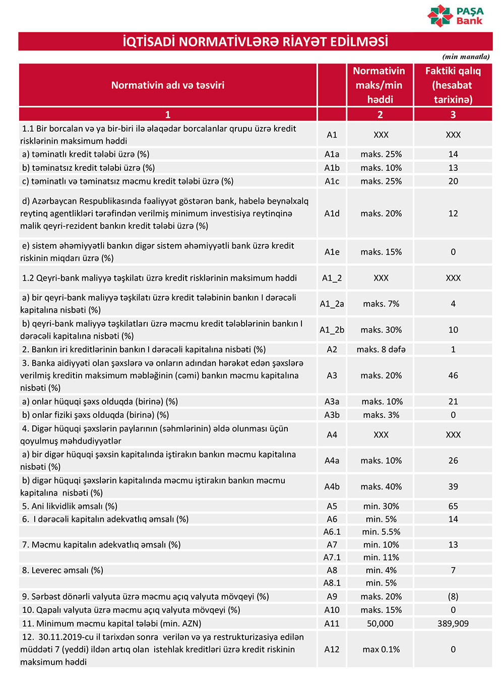 PAŞA Bank 119 milyon 689 min manat əməliyyat mənfəətindən aktivlər üzrə mümkün zərərlərin ödənilməsi üçün xüsusi ehtiyatın yaradılmasına 32 milyon 36 min manat ayırıb və 18 milyon 869 min manat mənfəət vergisi ödəyib. Beləliklə, Bank 9 ayı 69 milyon 285 min manat xalis mənfəət ilə bağlayıb.