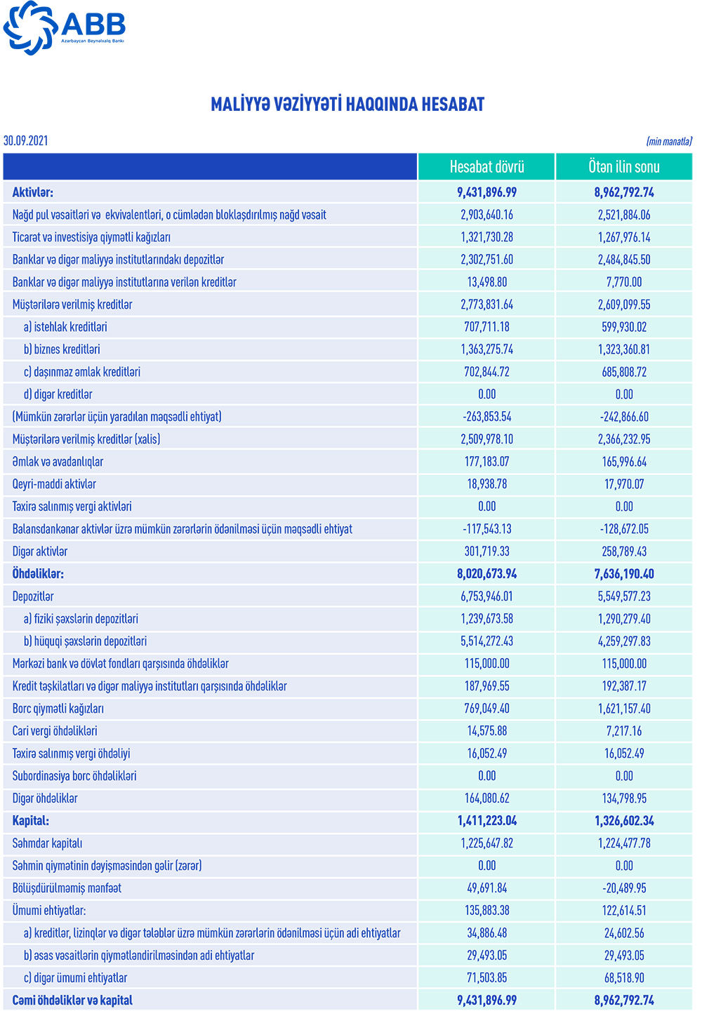 2020-ci ilin sonu ilə müqayisədə, cari ilin 9 ayında ABB-nin cəmi aktivləri 469 milyon 104 min manat və ya 5,2% artaraq 9 milyard 431 milyon 897 min manata yüksəlib.