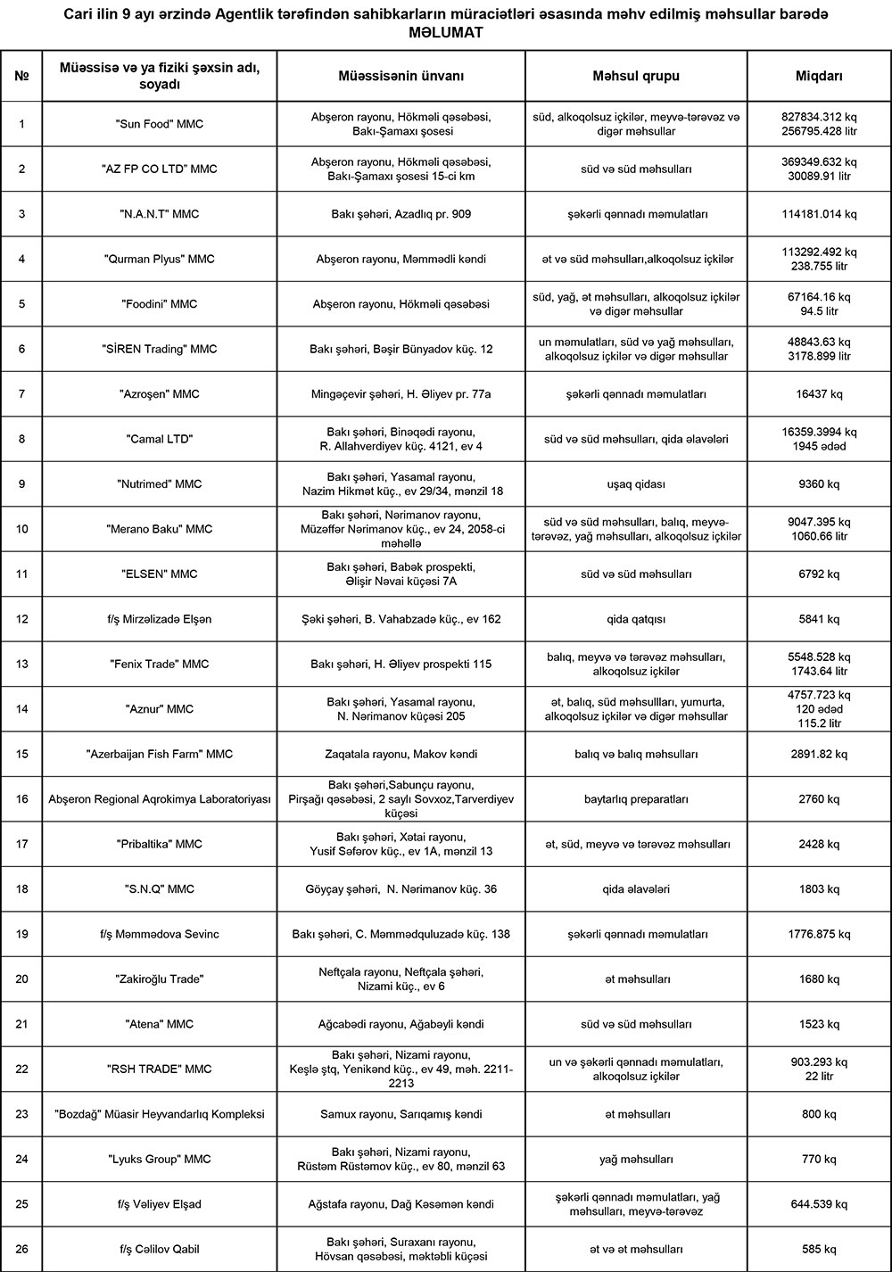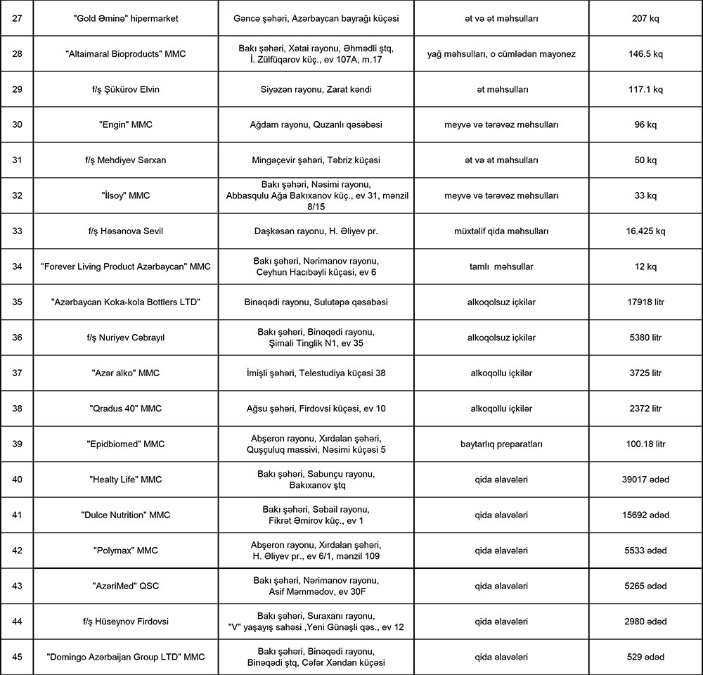 Həmin şirkətlərin və məhv olunmuş məhsulların siyahısı ictimaiyyətə açıqlanıb.
