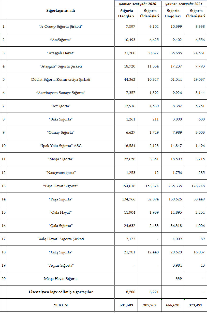 Qeyd edək ki, Azərbaycanda fəaliyyət göstərən sığortaçıların hesabladıqları sığorta haqları 2021-ci ilin 9 ayında ötən ilin eyni dövrü ilə müqayisədə 74 milyon 111 min manat və ya 12,7% artaraq 655 milyon 620 min manata çatıb. Müqayisə olunan dövrdə sığorta ödənişləri 65 milyon 729 min manat və ya 21,4% artaraq 373 milyon 491 min manata yüksəlib.