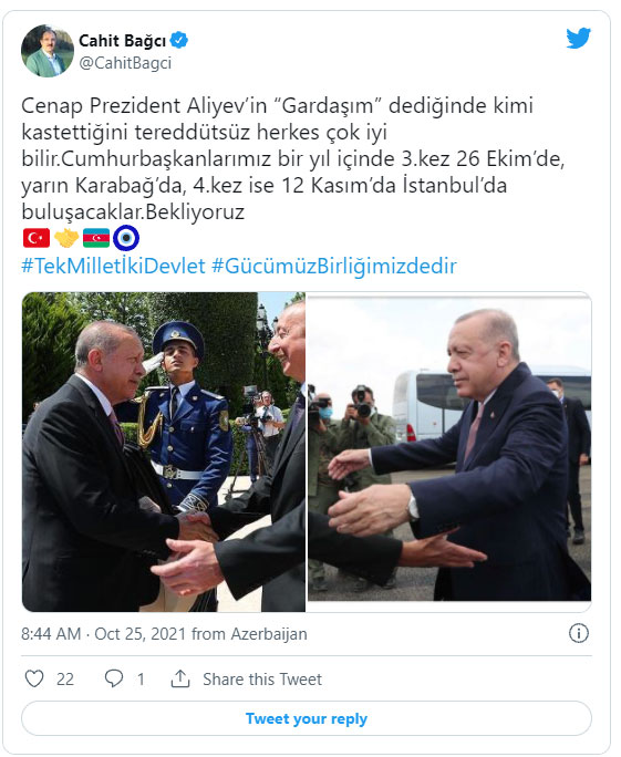 "Cənab Prezident İlham Əliyevin "Qardaşım" dediyi zaman kimi nəzərdə tutduğunu hamı çox yaxşı bilir. Prezidentlərimiz bir il ərzində 3-cü dəfə sabah - oktyabrın 26-da Qarabağda, 4-cü dəfə isə noyabrın 12-də İstanbulda görüşəcəklər. Gözləyirik", - səfir bildirib.