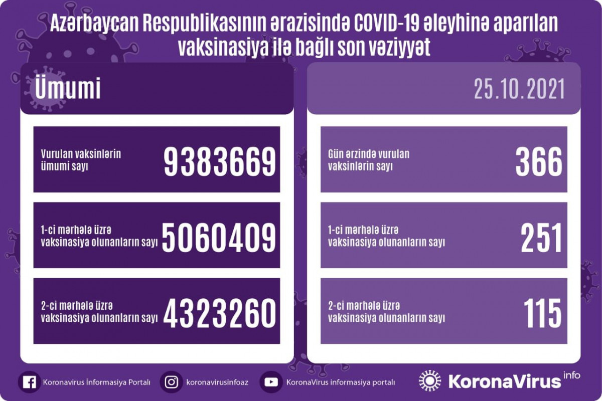 Ölkədə vurulan vaksinlərin ümumi sayı 9383669, birinci mərhələ üzrə vaksinasiya olunanların ümumi sayı 5060409, ikinci mərhələ üzrə vaksinasiya olunanların sayı isə 4323260 təşkil edir.