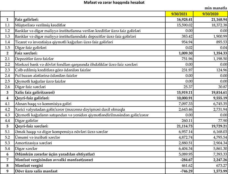 Müqayisə üçün qeyd edək ki, 2020-ci ilin 9 ayı ərzində “Yapı Kredi Bank Azərbaycan”ın cəmi əməliyyat gəlirləri 30 milyon 724 min manat, cəmi əməliyyat xərcləri 21 milyon 83 min manat, əməliyyat mənfəəti 9 milyon 640 min manat təşkil etmişdi. Bank ehtiyatlara 7 milyon 393 min manat ayırdığından və 673 min manat mənfəət vergisi ödədiyindən həmin dövrü 1 milyon 574 min manat xalis mənfəət ilə bağlamışdı.