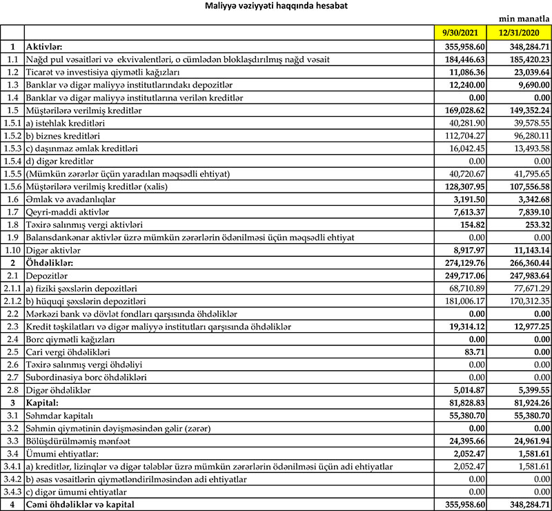 “Yapı Kredi Bank Azərbaycan”ın cəmi aktivləri 2021-ci ilin 9 ayında ötən ilin sonu ilə müqayisədə 7 milyon 674 min manat və ya 2,2% artaraq 355 milyon 958 min manata çatıb.