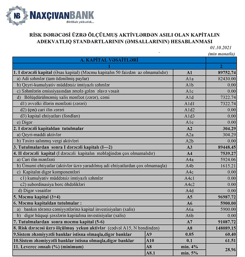 30 Sentyabr 2021-ci il tarixində “Naxçıvanbank”ən məcmu kapitalı 91 milyon 85 min manat təşkil edib.
