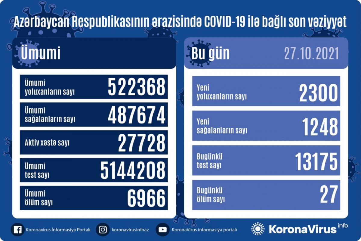 Xatırladaq ki, 26 oktyabr 2021-ci il tarixində 2266 yoluxma faktı və 24 ölüm qeydə alındığı açıqlanmışdı. 13 Dekabr 2020-ci il tarixində açıqlanmış fakt (4451) bugünədək qeydə alınmış ən yüksək günlük yoluxma sayı idi.