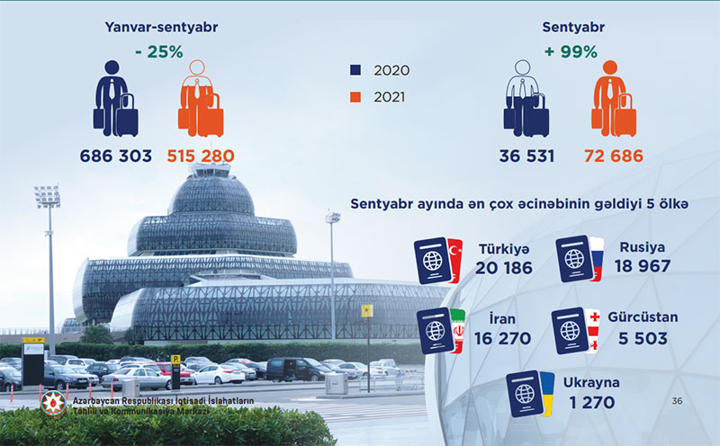 Təkcə ötən ay isə Azərbaycana 72 min 686 nəfər əcnəbi səfər edib. Bu isə ötən ilin sentyabr ayına nisbətən 99% və yaxud təxminən 2 dəfə çoxdur. (2020-ci ilin sentyabr ayında 36 min 531 nəfər olub).