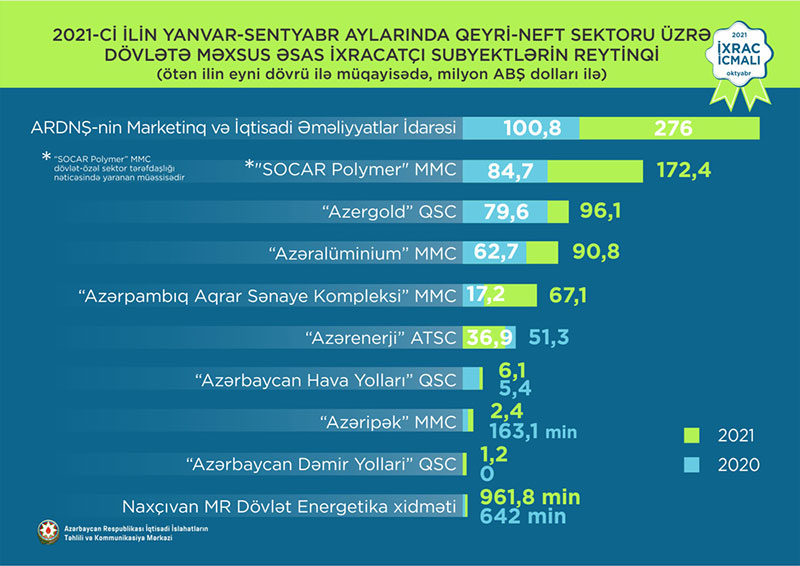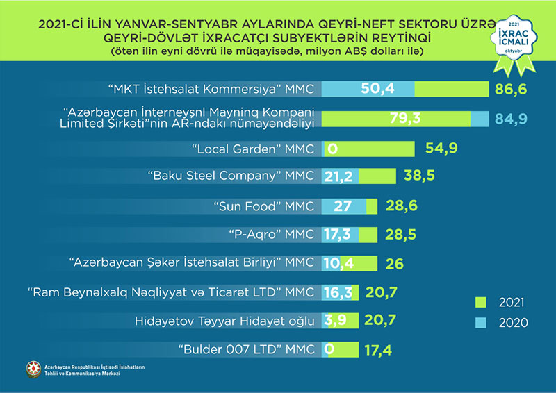 2021-ci ilin yanvar-sentyabr ayları üzrə hazırlanan qeyri-dövlət ixracatçı subyektlərin reytinqində ilk onluqda aşağıdakı şirkətlər təmsil olunurlar: “MKT İstehsalat Kommersiya” MMC, “Azərbaycan İnterneyşnl Mayninq Kompani Limited Şirkəti”nin Azərbaycan Respublikasındakı Nümayəndəliyi, “Local Garden” Məhdud Məsuliyyətli Cəmiyyəti, “Baku Steel Company” MMC, “Sun Food” MMC, “P-Aqro” MMC, “Azərbaycan Şəkər İstehsalat Birliyi” MMC, “RAM Beynəlxalq Nəqliyyat və Ticarət LTD” MMC, Hidayətov Təyyar Hidayət oğlu, “Bulder 007 LTD” MMC.