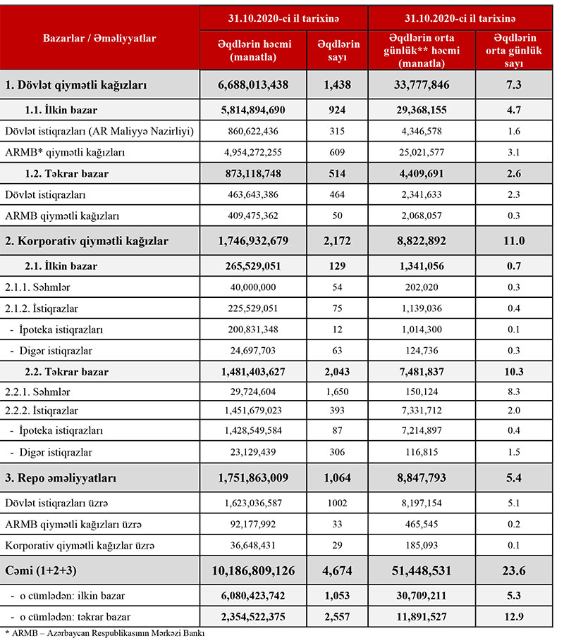Dövlət istiqrazları ilə təkrar bazarın həcmi isə ötən ilin 10 ayında 463 milyon 643, min 386 manat ikən, bu ilin 10 ayında 817 milyon 485 min 971 manat təşkil edib.