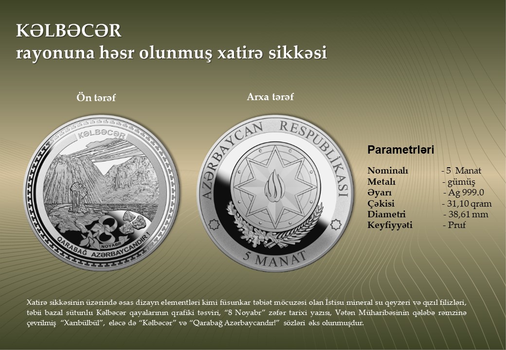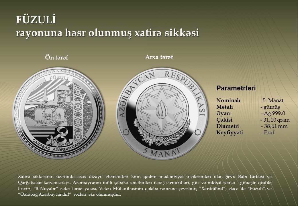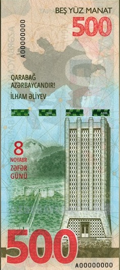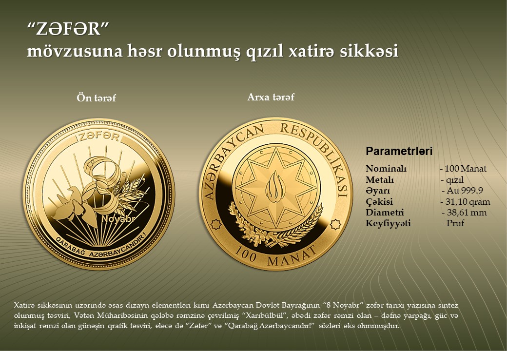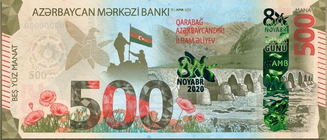 Azərbaycan Mərkəzi Bankı 500 manat nominallı “ZƏFƏR” xatirə banknotunun, qızıl və gümüşdən hazırlanmış “Zəfər” xatirə monetasının, eləcə də düşmən tapdağından azad edilmiş şəhər və rayonlarımızın tarixi-mədəni irsinin beynəlxalq ictimaiyyətə çatdırılması məqsədilə “Şuşa” şəhərinə, “Cəbrayıl”, “Qubadlı”, “Ağdam”, “Zəngilan”, “Füzuli”, “Laçın”, “Kəlbəcər”, “Xocavənd” rayonlarına və “Suqovuşan” qəsəbəsinə həsr olunan gümüş xatirə sikkələrinin tədavülə buraxılmasını elan edir. 20 manatlıq yenilənib, növbəti ildən tədavülə buraxılacaqAzərbaycan Respublikasının Silahlı Qüvvələrinin Ali Baş Komandanı İlham Əliyevin rəhbərliyi ilə 2020-ci ildə aparılmış 44 günlük Vətən Müharibəsində Azərbaycan ordusunun tarixi Zəfərinin ildönümü münasibətilə tədavülə buraxılan xatirə pul nişanlarının Mərkəzi Bankda təqdimat mərasimi keçirilib.