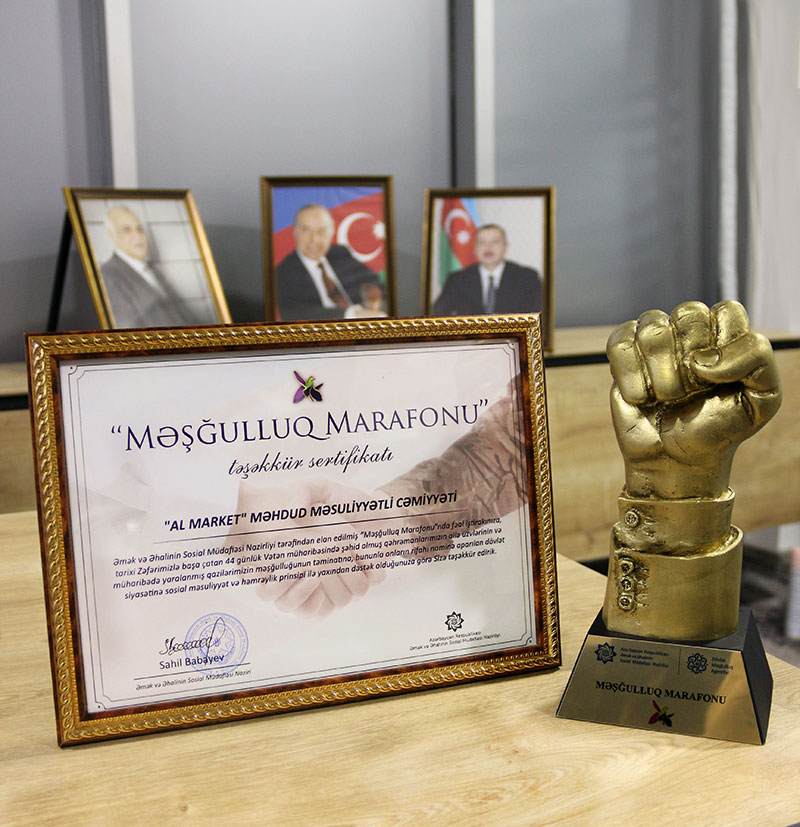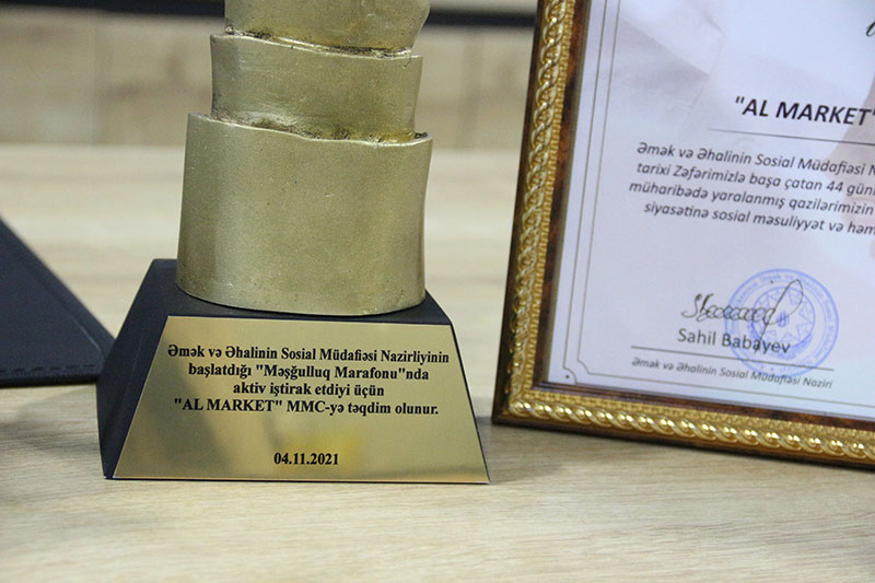 44 günlük Vətən müharibəsində şəhid olmuş qəhrəmanların ailə üzvlərinin və müharibədə yaralanmış qazilərin məşğulluğunun təminatına yaxından dəstək olduğuna görə “Al market”lər Əmək və Əhalinin Sosial Müdafiəsi Nazirliyi tərəfindən elan edilmiş “Məşğulluq Marafonu”nda ən aktiv iştirakçı kimi təşəkkür sertifikatı və “Dəmir yumruq” mükafatına layiq görülüb. Bu proses hələ də davam edir və il sonuna kimi daha 2 Açıq Qapı gününün keçirilməsi nəzərdə tutulub.