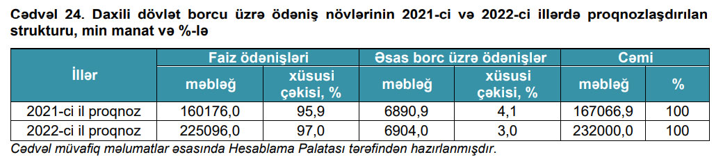 Daxili dövlət borcu üzrə 2022-ci ildə 225 milyon 96 min manat faiz, 6 milyon 904 min manat əsas borc ödənişləri nəzərdə tutulur (cəmi 232 milyon manat). 2021-ci ildə isə160 milyon 176 min manat faiz ödənişləri, 6 milyon 890,9 min manat əsas borc ödənişləri olmaqla 167 milyon 66,9 min manat cəmi ödəniş proqnozlaşdırılır.