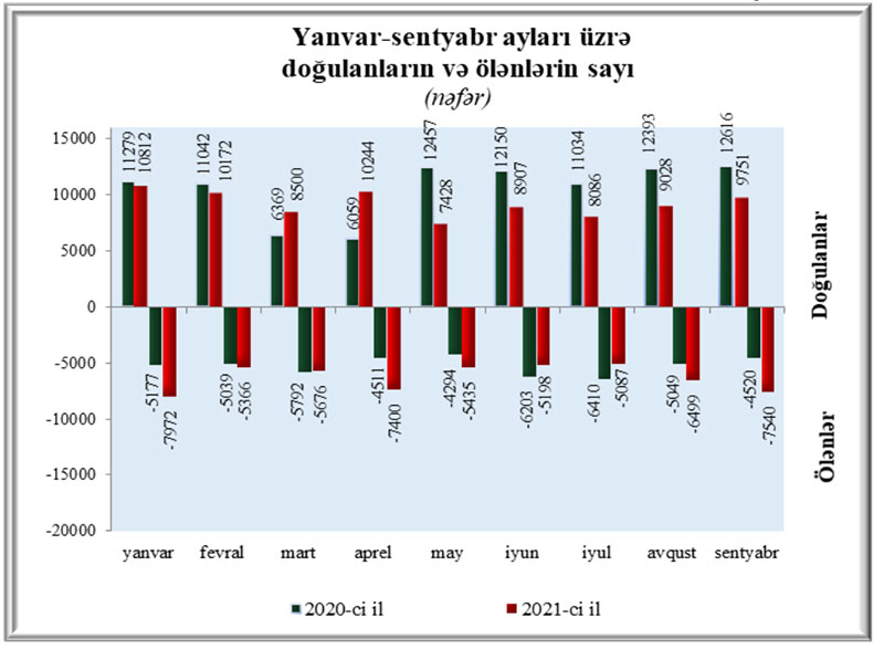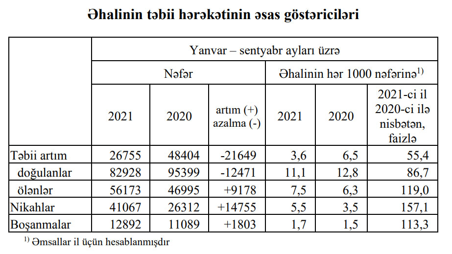 Bu ilin 9 ayında ölkə üzrə 56 min 173 ölüm halı qeydə alınmış və əhalinin hər 1000 nəfərinə ölüm səviyyəsi 7,5 təşkil etmişdir. 2021-ci ilin yanvar-sentyabr aylarında qeydiyyat şöbələri tərəfindən 41 min 67 nikaha daxilolma və 12 min 892 boşanma halları qeydə alınmış və əhalinin hər 1000 nəfərinə 2020-ci ilin müvafiq dövrü ilə müqayisədə nikahların sayı 3,5-dən 5,5-ə, boşanmaların sayı isə 1,5-dən 1,7-yə qədər artmışdır. Cari ilin yanvar-sentyabr ayları ərzində Daxili İşlər Nazirliyi və Dövlət Miqrasiya Xidmətinin müvafiq qurumları tərəfindən daimi yaşamaq üçün Azərbaycana 1847 nəfər gələn, Azərbaycandan isə 355 nəfər gedən qeydə alınmış, miqrasiya saldosu müsbət 1492 nəfər təşkil etmişdir.