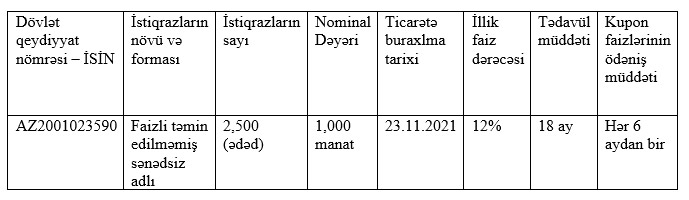 Yerləşdiriləcək həcm hər birinin nominal dəyəri 1 min manat olan 2 min 500 ədəd faizli təmin edilməmiş sənədsiz istiqrazlardan ibarətdir. İllik faiz dərəcəsi 12%, tədavül müddəti 18 aydır. Kupon faizlərihər 6 aydan bir ödəniləcəkdir.