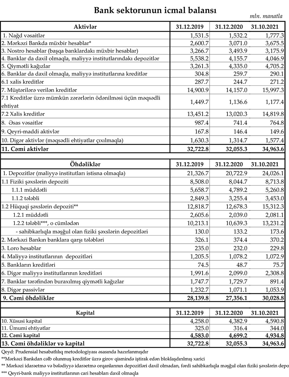Hesabata görə, 31 Oktyabr 2021-ci il tarixində Azərbaycanın bank sektoru 34 milyard 963.6 milyon manat cəmi aktivlərə , o cümlədən 15 milyard 997.3 milyon manat müştərilərə verilmiş cəmi kreditlərə malik olub. Sektor 2020-ci ilin sonunda 32 milyard 55.3 milyon manat cəmi aktivlərə və 14 milyard 157 milyon manat kredit portfelinə malik idi. Beləliklə, 2021-ci ilin 10 ayında sektor 2 milyard 908.3 milyon manat böyüyüb, müştərilərə verilmiş cəmi kreditlər 1 milyard 840.3 milyon manat artıb.