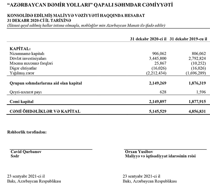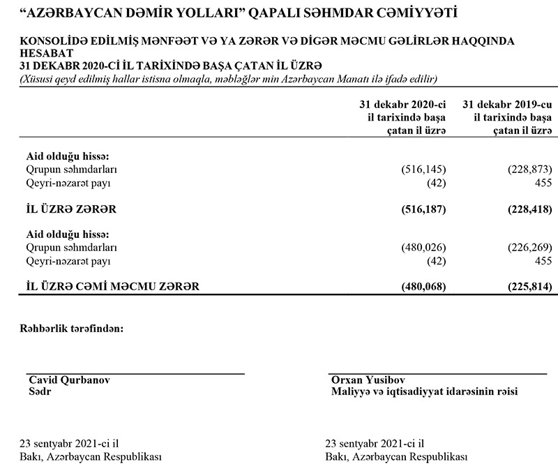 "Azərbaycan Dəmir Yolları"nın yığılmış zərəri 2 milyard manatı keçib“Azərbaycan Dəmir Yolları” QSC 2020-ci ili 516 milyon 187 min manat xalis zərərlə başa vurub.