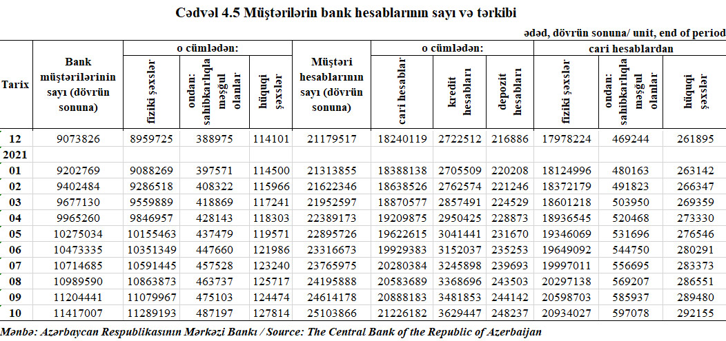 Azərbaycan banklarında depozit hesabları oktyabr ayında 4 min 95, cari ilin 10 ayı ərzində isə 31 min 351 artaraq 248 min 237-yə çatıb. 2020-ci ilin sonunda depozit hesabları 216 min 886 sayda olmuşdu.