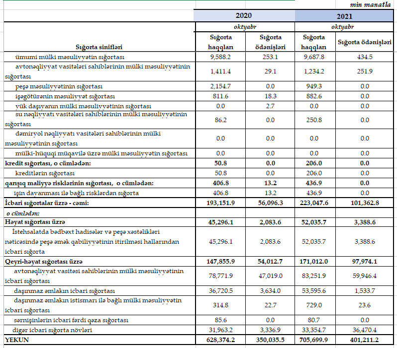 Beləliklə, 2021-ci ilin yanvar-oktyabr aylarında həyat sığortası bazarında toplanmış hər 100 manat sığorta haqqının 68,9 manatı, qeyri-həyat sığortası bazarında toplanmış hər 100 manat sığorta haqqının isə 47,2 manatı müştərilərə geri ödənilib. Bu rəqəmlər 2020-ci ilin yanvar-oktyabr aylarında müvafiq olaraq 84,1 manat və 35,75 manat olub.