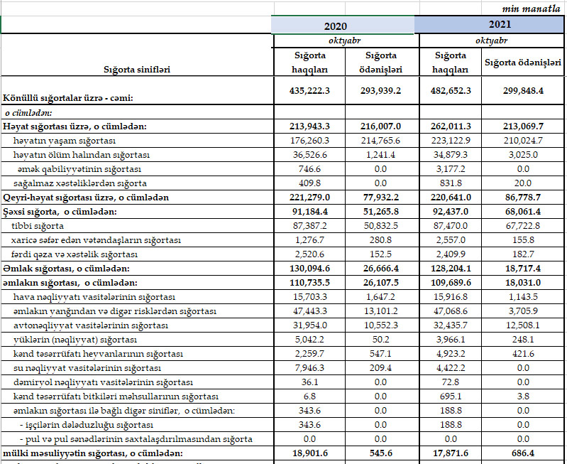 Hesabat dövründə könüllü sığorta növləri isə ödənişlərin məbləği 299 milyon 848 min manat təşkil edib ki, bu da 1 il əvvələ nisbətən 2% çoxdur. İl ərzində icbari sığorta növləri üzrə ödənişlərin məbləği isə 80,7% artaraq 101 milyon 363 min manata çatıb.