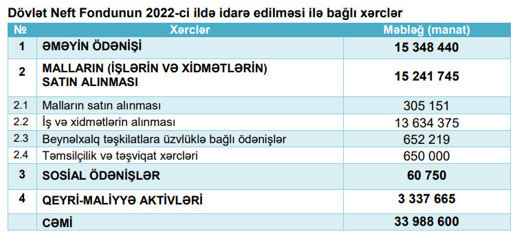 Qeyd edilib ki, 2022-ci il üçün Dövlət Neft Fondunun büdcə layihəsində Fondun idarə edilməsi ilə bağlı ümumi xərcləri 33 milyon 988,6 min manat məbləğində olması proqnozlaşdırılır ki, bu da 2020-ci ilin müvafiq icra göstəricisindən 12,8 milyon manat və ya 60,4% çox, 2021-ci ilin proqnoz göstəricisindən 5,1 milyon manat və ya 17,6% və gözlənilən icra göstəricisindən 11,1 milyon manat və ya 48,4% çoxdur.