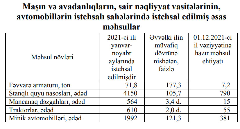 Xatırladaq ki, 2020-ci ildə Azərbaycanda 1949 ədəd və ya 2019-cu illə müqayisədə 411 ədəd az minik avtomobili, 300 ədəd və ya 2019-cu illə müqayisədə 66.9% az traktor istehsal edilmişdi.