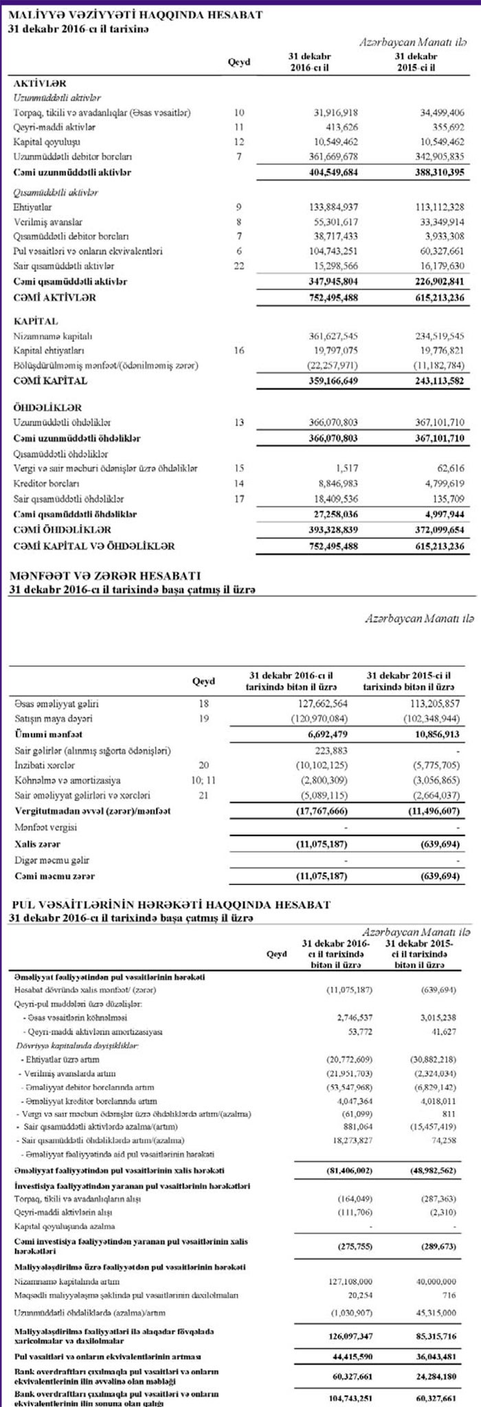 “Aqrolizinq” ASC 2016-cı ili 11 milyon 75 min manat zərər ilə başa vurub.
