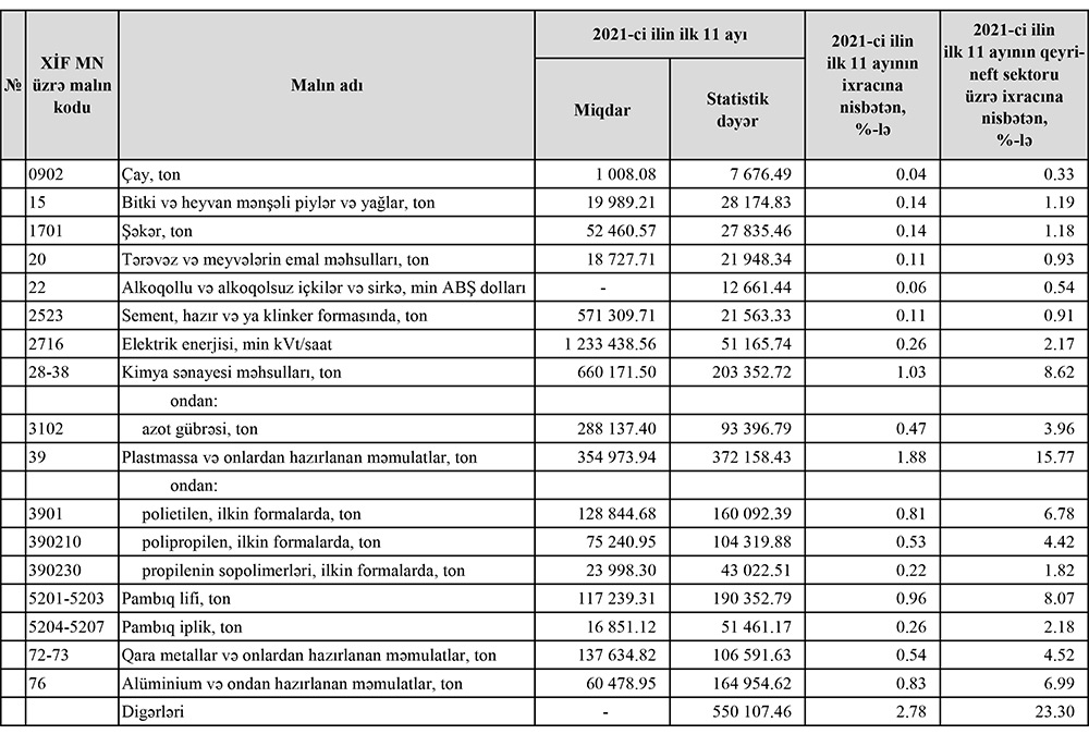 2021-ci ilin yanvar-noyabr aylarında (11 ayda) Azərbaycanın ən çox ixrac və idxal etdiyi mallar açıqlanıb.
