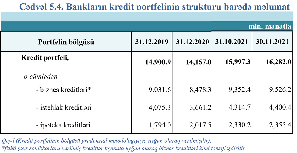 2020-ci ilin sonuna nisbətən, 2021-ci ilin 11 ayı ərzində biznes kreditləri 1 milyard 47,9 milyon manat, istehlak kreditləri 739,2 milyon manat, ipoteka kreditləri isə 337,9 milyon manat artıb.