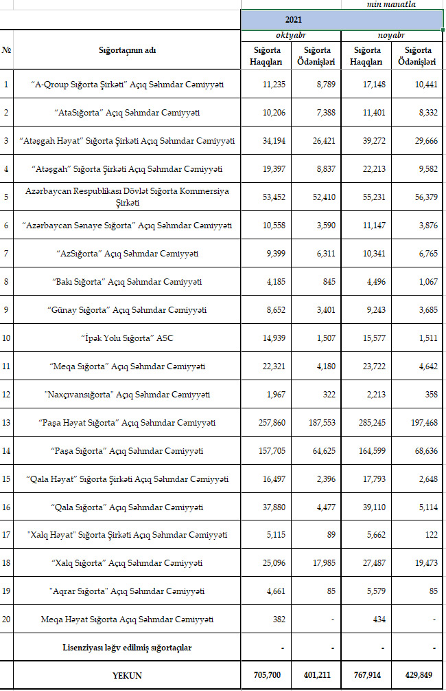 Bu ilin yanvar-noyabr aylarında Azərbaycandakı 20 sığorta şirkətinin xətti ilə 767 milyon 914 min manat məbləğində sığorta haqqı toplanılıb.