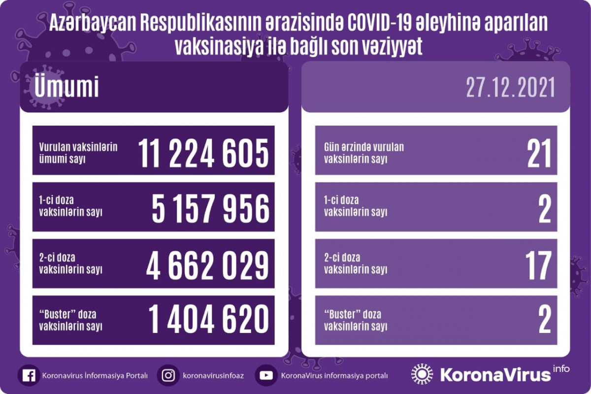 Azərbaycanda son sutkada koronavirus (COVID-19) əleyhinə 21 vaksin vurulub. Bir gündə birinci mərhələ üzrə vaksinasiya olunanların sayı 2, ikinci mərhələ üzrə vaksinasiya olunanların sayı 17, buster doza üzrə vaksinasiya olunanların sayı isə 2 nəfərdir.